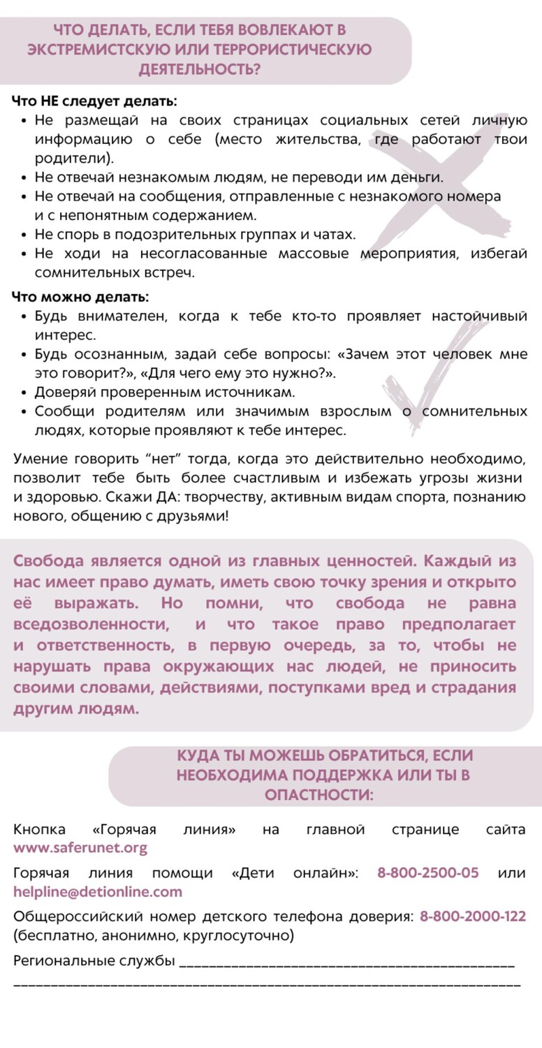 — Контролируйте информацию, которую получает ребенок. Обращайте внимание, какие передачи смотрит, какие книги читает, на каких сайтах бывает. СМИ является мощным орудием в пропаганде антиобщественных элементов.