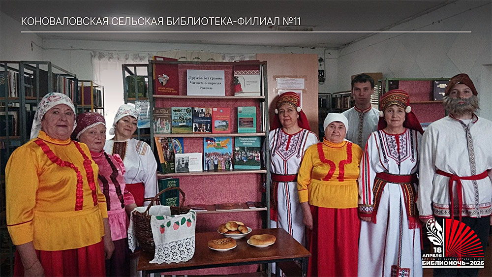 Коноваловская сельская библиотека‑филиал № 11 провела литературно‑музыкальную гостиную «Венок дружбы», где гости погрузились в атмосферу праздника благодаря театрализованному представлению «Рожтуань куда» («Рождественский дом») и чтению стихотворения «Дружба народов». Книжная выставка «Дружба народов без границ: читаем о народах России» познакомила посетителей с литературными произведениями о традициях и культуре, а визит в музей «Мордовская изба» позволил прикоснуться к этнографическому наследию. Вечер завершился музыкальной программой с исполнением мордовских народных песен.