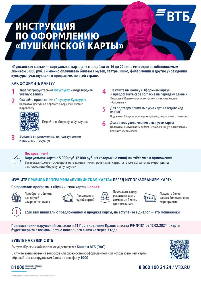 | В нашей стране действует культурная программа «Пушкинская карта», созданная по инициативе Президента РФ и направленная на приобщение молодежи к культурным ценностям. «Пушкинская карта» — специальная банковская карта, которой молодым людям от 14 до 22 лет можно будет расплачиваться при покупке билетов в музеи, театры, концертные залы, филармонии, консерватории и другие учреждения культуры по всей стране. Карта выпускается в виртуальном формате, программа предусматривает в 2026 году перечисление на карту каждому ее участнику финансовой поддержки от государства в размере 5 000 рублей. «Пушкинская карта» – это важнейший социальный проект, направленный на поддержку молодежи и ее культурное развитие. Кроме того, это очень современный, удобный и эффективный подход. С одной стороны, он позволяет молодёжи приобщиться к культурным ценностям, получать новые знания и впечатления, а с другой – придаёт новый импульс и оказывает поддержку всей отрасли культуры и искусства. Получить всю необходимую информацию о выпуске карты вы можете по ссылкам: https://culture.gosuslugi.ru/ https://www.vtb.ru/personal/karty/debetovye/pushkinskaya_karta/ https://www.culture.ru/ https://max.ru/pushkincard_bot ![]() ![]() | |